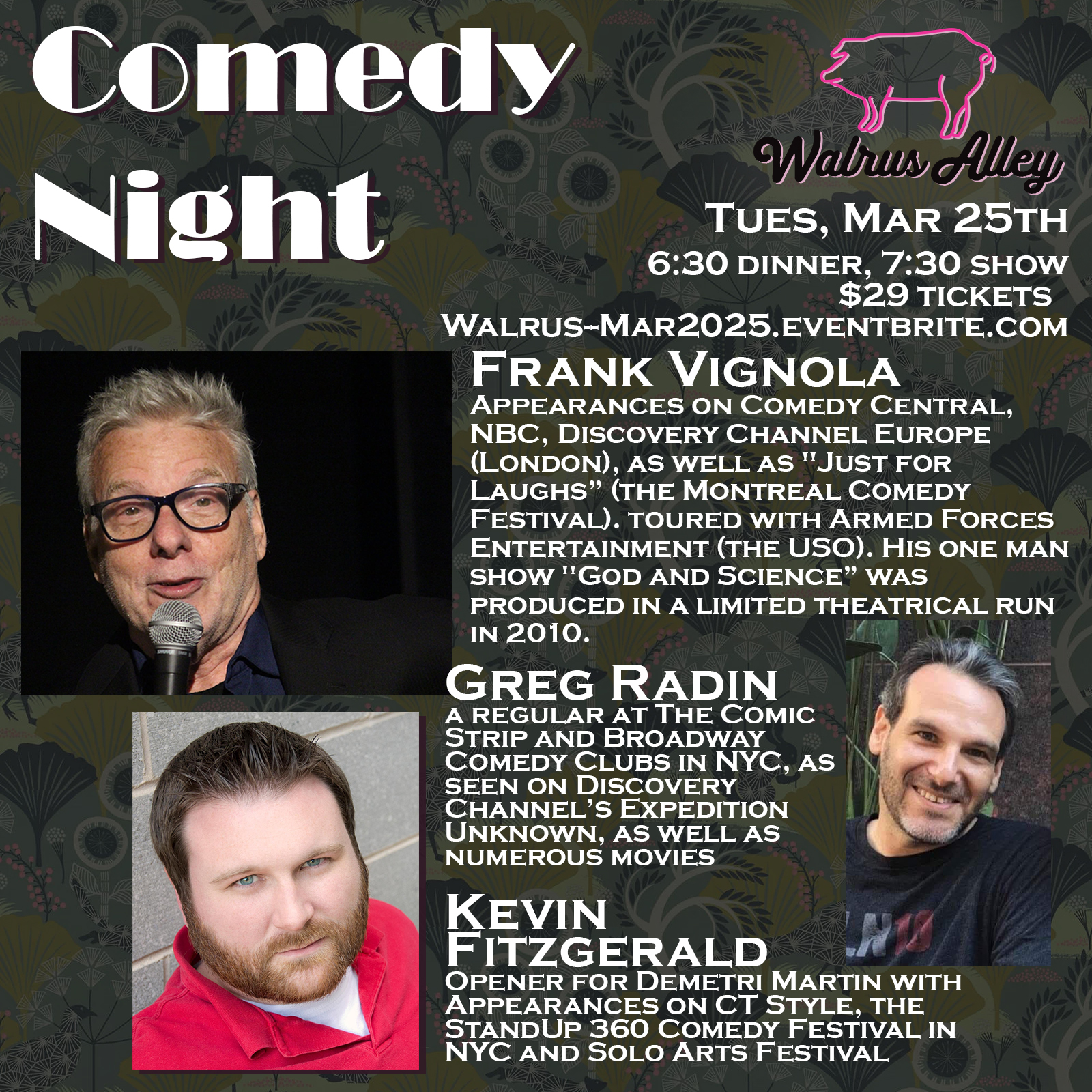 Join us for a night of comedy, when we open our doors to guests with a few laughs, an extensive beer list, and amazing eats from the Walrus kitchen. As we are typically closed on Tuesdays, this special event requires tickets to attend.